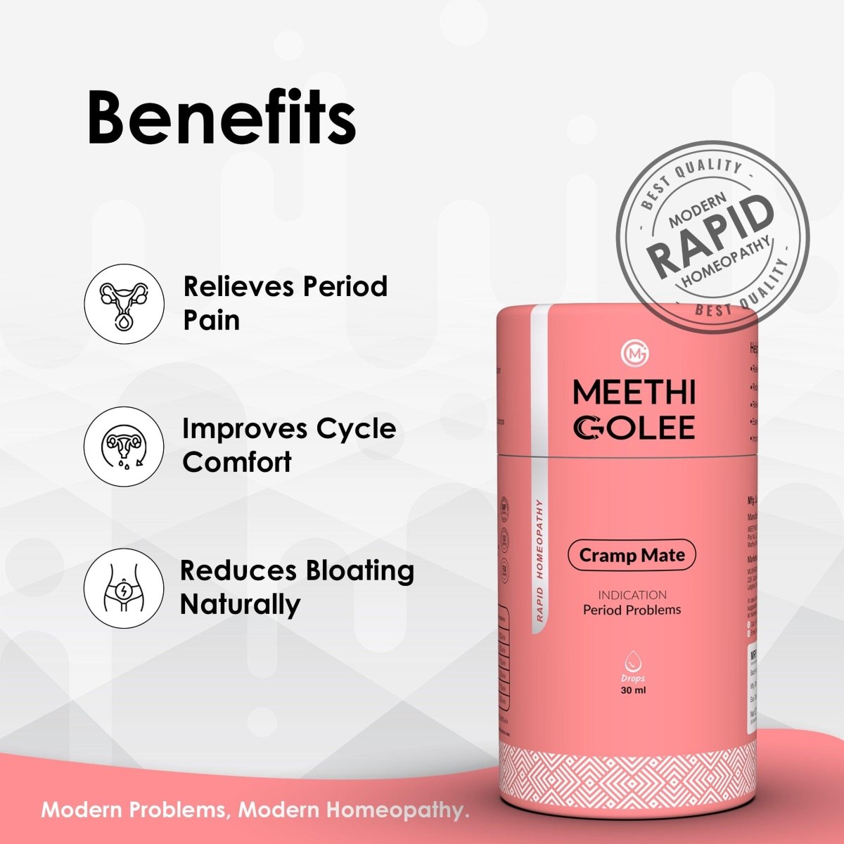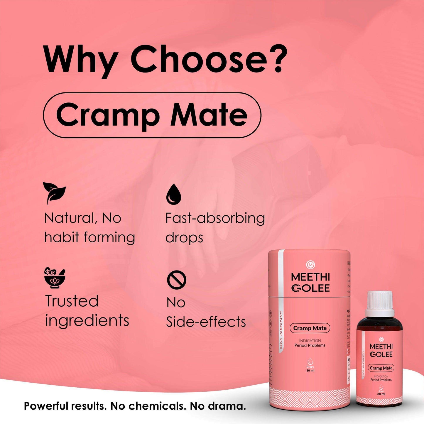 Cramp Mate is an advanced homeopathic formula made to ease menstrual cramps, reduce bloating, and support mood balance. It works naturally with your body to make your periods more manageable—without side effects and gives you healthy periods!