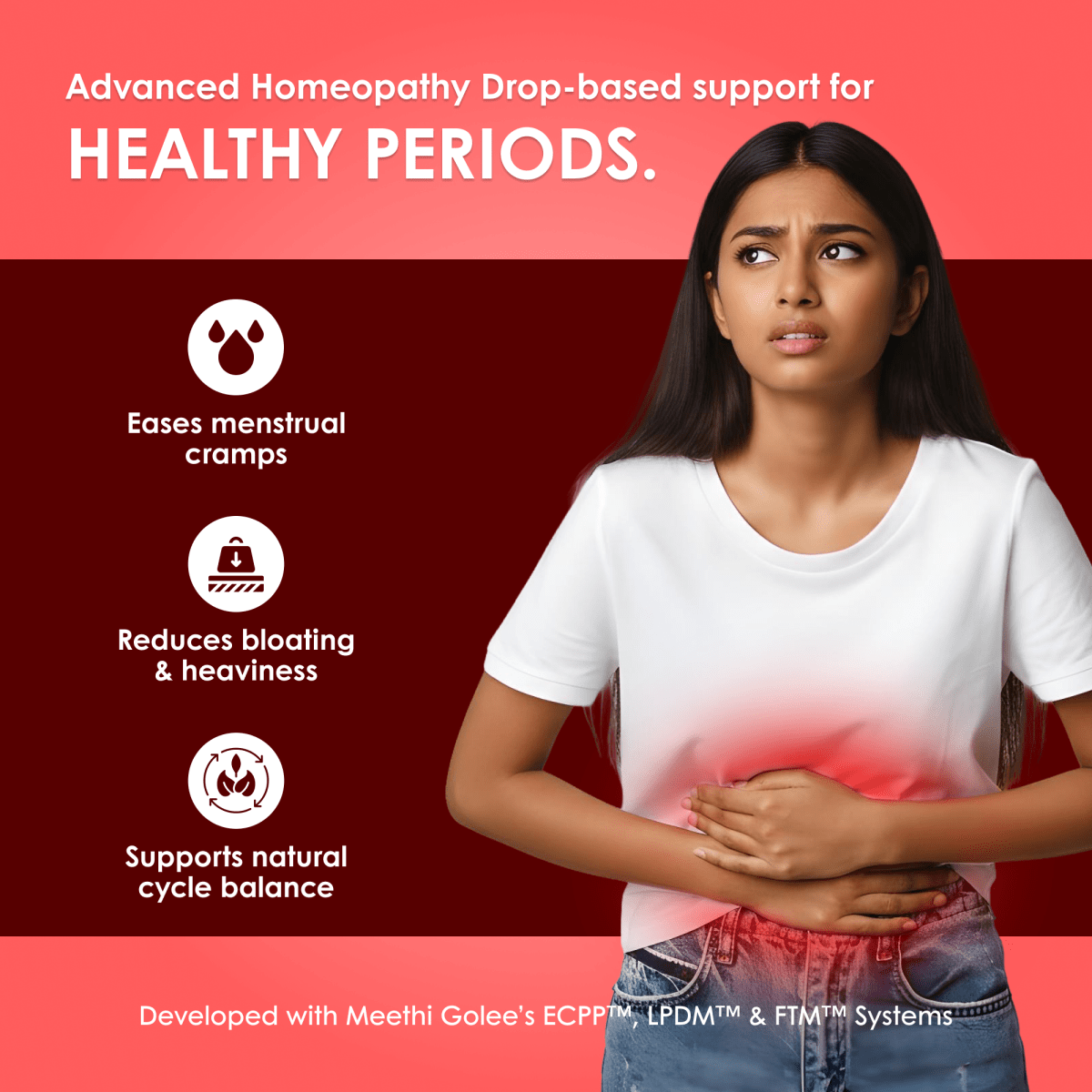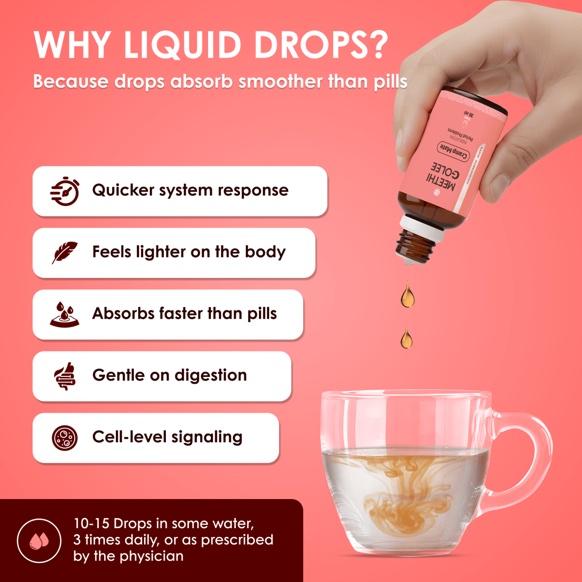 During periods, digestion can be sensitive and nausea is common. Liquid drops allow easy intake, faster absorption, and consistent internal signalling, without tablet load or stomach discomfort.