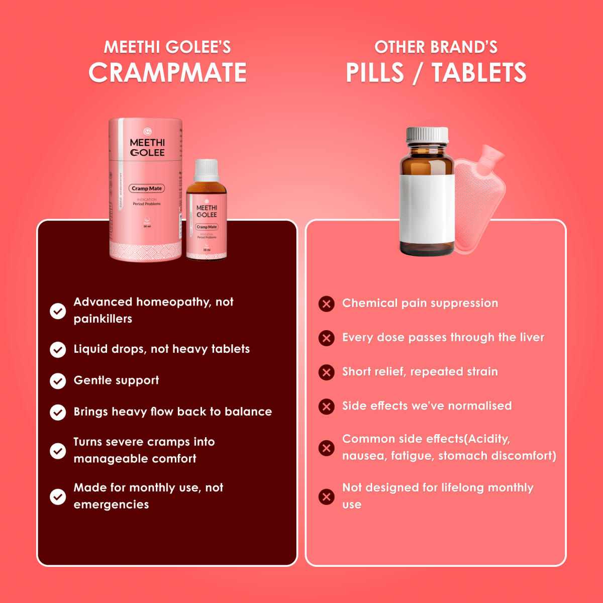 Period pain is caused by uterine muscle spasms, altered blood flow, and inflammatory signalling during the menstrual cycle. Painkillers block pain temporarily but do not correct the underlying spasm pattern. Cramp Mate works internally to support muscle relaxation and cycle balance, not pain masking.